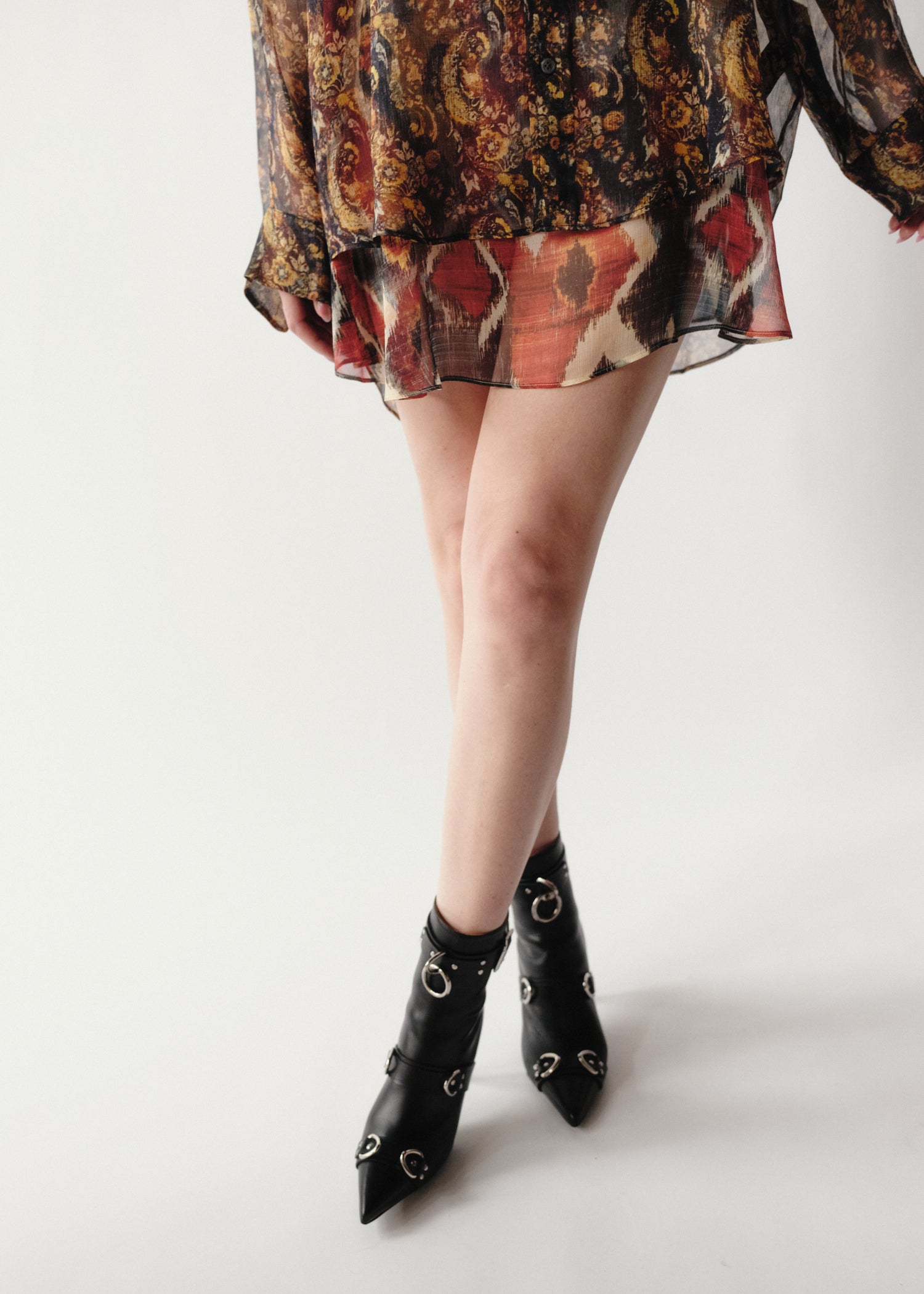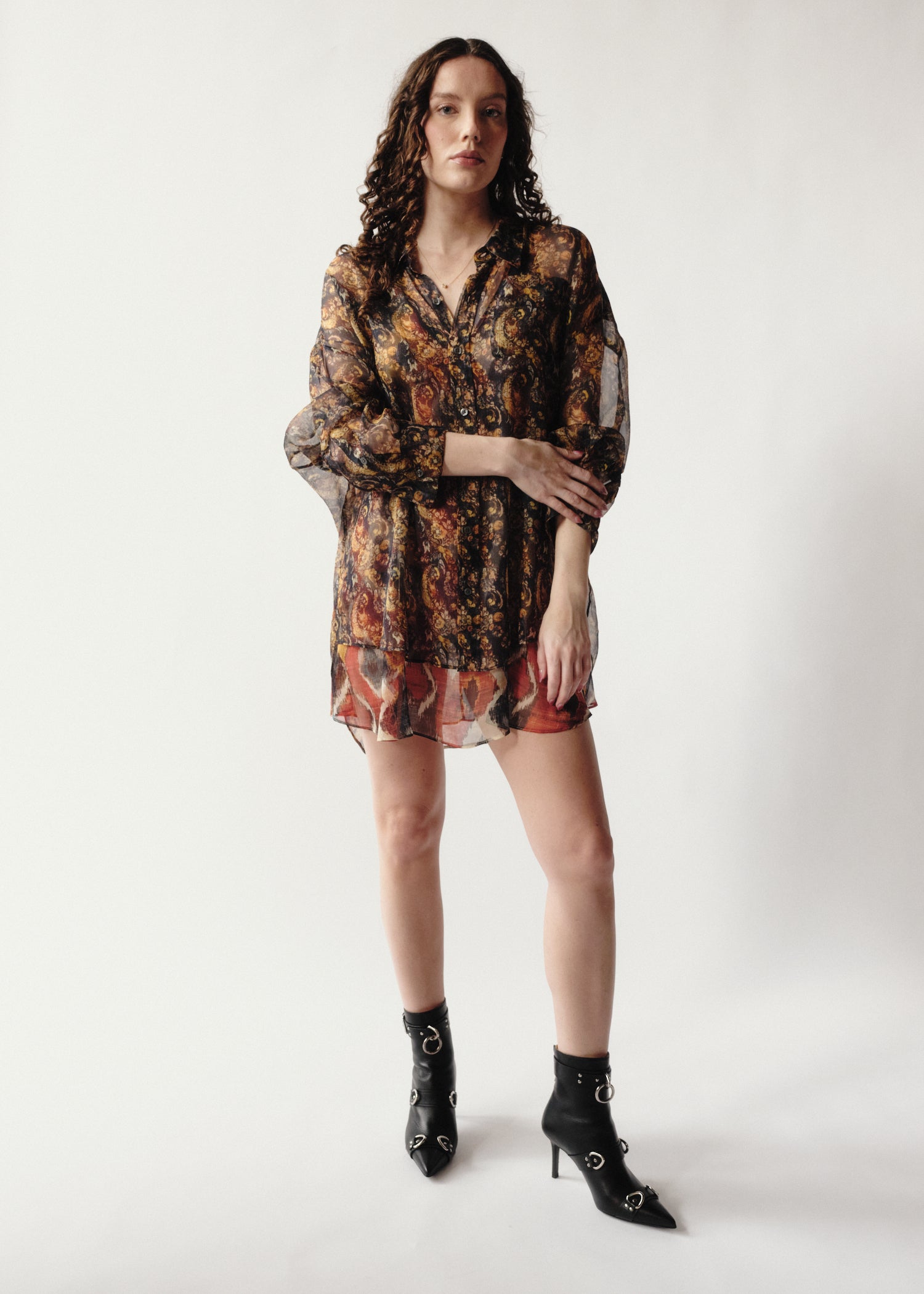 Printed chiffon set consisting of an ikat print slip and paisley long shirt